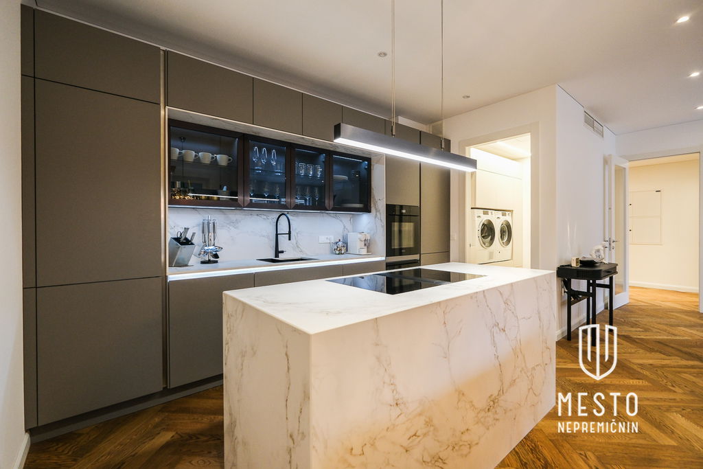 Stanovanje obsega predsobo, svetel dnevno-bivalni prostor z izhodom na jugozahodno orientiran balkon, sodobno kuhinjo z jedilnico, spalnico, utility, kopalnico s tušem ter ločene sanitarije. Kuhinja po meri je opremljena z vrhunskimi aparati Miele (tudi vinska vitrina) ter indukcijsko kuhalno ploščo Bora, integrirano v kuhinjski otok.