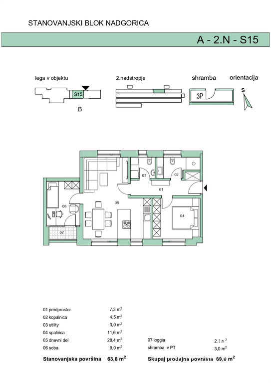 Na odlični lokaciji v Nadgorici prodamo 3-sobno stanovanje. Stanovanje je del novega stanovanjskega bloka s 16 stanovanji različnih velikosti, od kompaktnih garsonjer do prostornih 3-sobnih enot. Novogradnja se z uporabo kvalitetnih materialov, z veliko mero termoizolacije in sodobne tehnike, uvršča med pasivne (energetski razred A2), kar zagotavlja majhno porabo energije. Objekt odlikuje funkcionalna in moderna gradnja, ki bo navdušila vse, saj omogoča prilagoditev potrebam prav vseh kupcev, tako posameznikov kot družin. Slednje bo soseska še dodatno navdušila, saj vključuje otroško igrišče in druge površine za igro, kjer se lahko otroci zabavajo in razvijajo. Stanovanju pripada shramba v kleti in eno parkirno mesto, ki je opremljeno tudi s predpripravo za namestitev elektro polnilnice. Stanovanje ima tudi pokrit balkon.